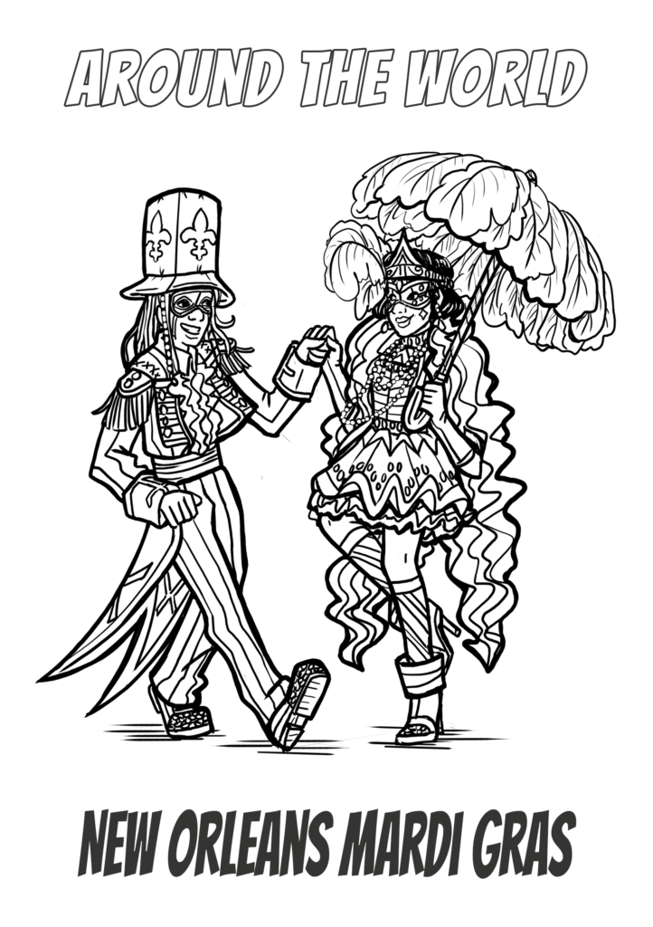 You can download and print the coloring activity below! See our video for inspiration on using purple, green, and gold, the colors that represent Mardi Gras!